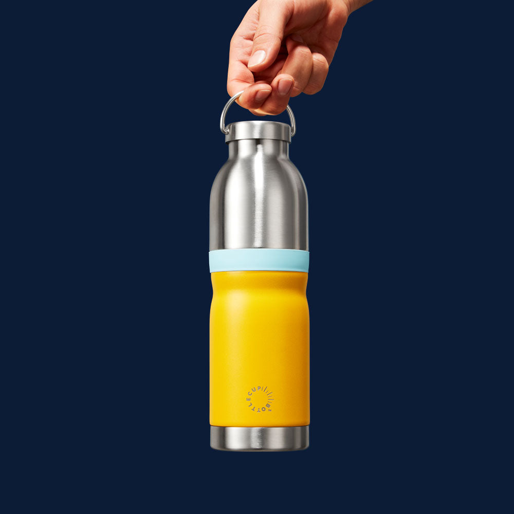 We've gone to town on the details such as the coffee cup lid which is stored safely and hygienically in the base of the cup when not in use. The bottlecup waist has a curve which creates a comfortable position to place your hand. The silicone band not only adds a pop of colour, but crucially provides a seal between the bottle and cup to prevent coffee dribbles after use. And we've even added a little extra finger space when holding the carry loop thanks to the subtle concave bottle lid. Not a millimetre was overlooked!